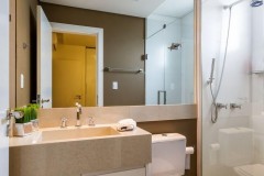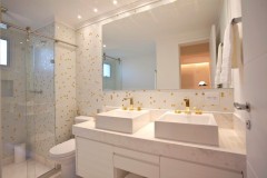 Recomendamos utilizar armários planejados de modo que o aproveitamento de cada espaço seja bem distribuído. Outra vantagem do banheiro planejado é a possibilidade de escolher as divisórias internas dos armários, os nichos para compor e os materiais que se adequam ao seu estilo.